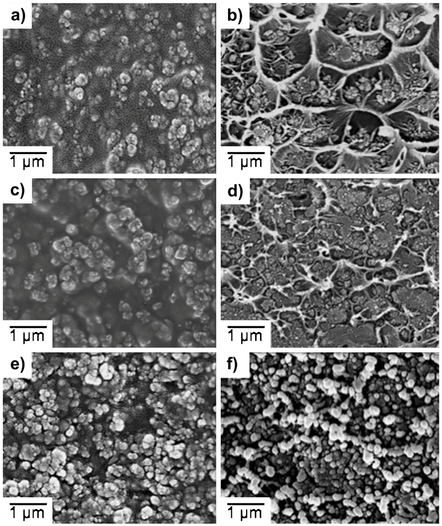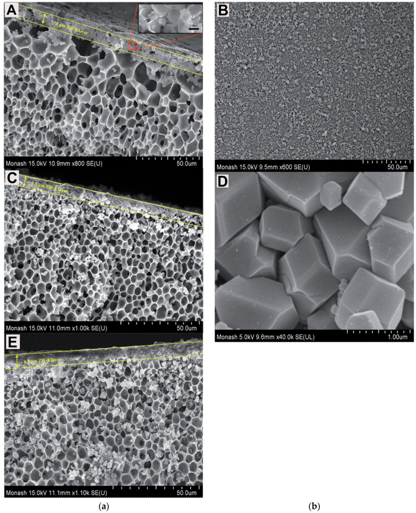 SEM images of surfaces (a,c,e) and cross-sections (b,d,f) of ZIF-8/Matrimid® MMMs: (a,b) 30%; (c,d) 50%; and (e,f) 80% (w/w). Adapted with permission from [216]. Copyright, 2010, Elsevier.