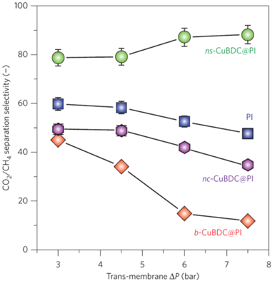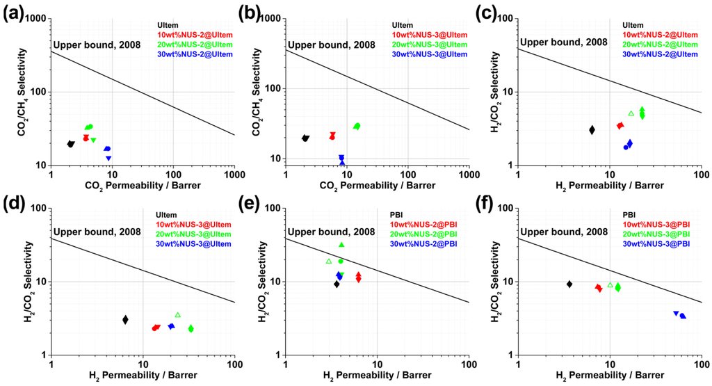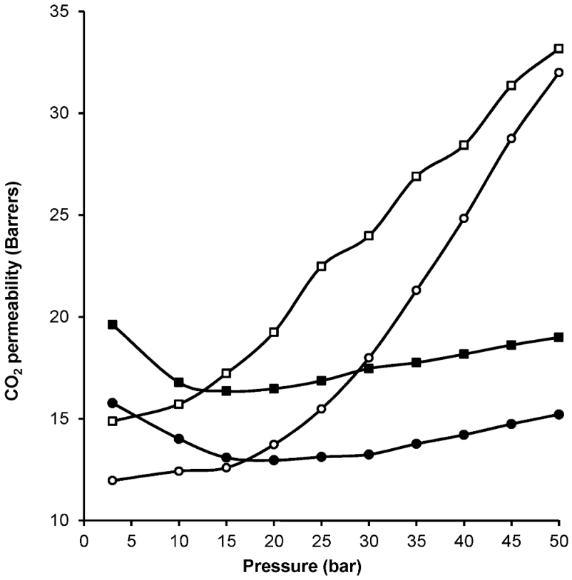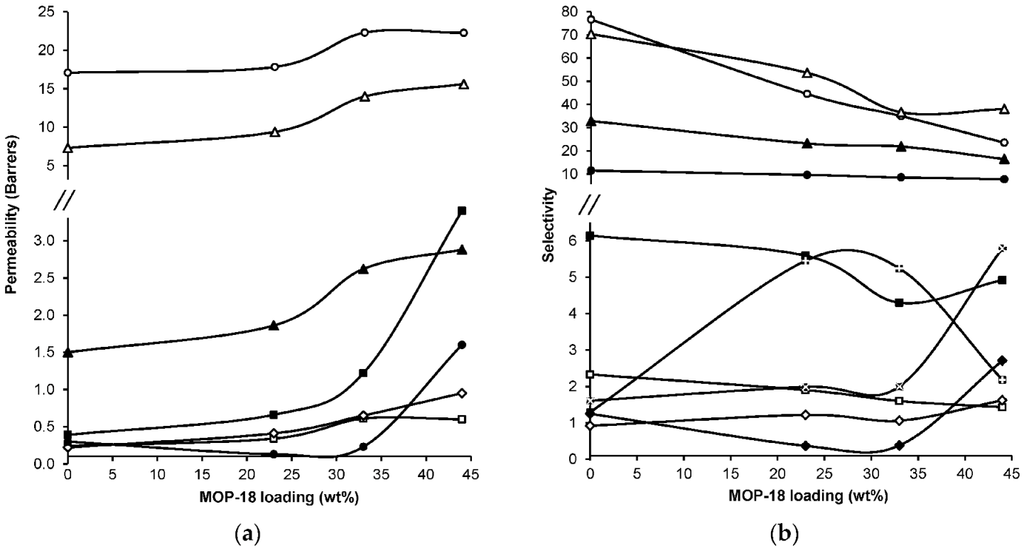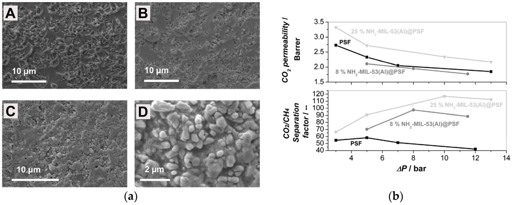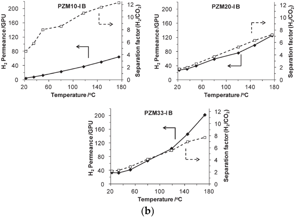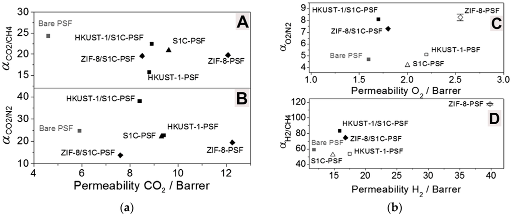 In another study, Jha and co-workers were able to obtain an increased CO2/N2 selectivity, from 43 to 54, by preparing MMMs with methoxy ethoxy ethanol (MME)-substituted PPZ and SAPO-34 [166]. PPZ’s rubbery nature allows better interfacial contact with the additive. By converting to MME-substituted PPZ, the CO2 selectivity of the MMMs was increased. Their MMMs showed gas separation properties that surpassed the Robeson upper bound for CO2/N2 separations. Another study carried out in 2010 was based on acrylate-derivatized polysulfone (PSf-acrylate) and zeolite 3A for the separation of H2 from CO2 [167]. Unmodified PSf has a H2/CO2 separation factor of 1.53, but the 40% zeolite 3A-PSF-acrylate MMM exhibited an improved selectivity of 3.57. With further increase in zeolite loading, however, the H2 permeability increased and the selectivity ratio decreased.