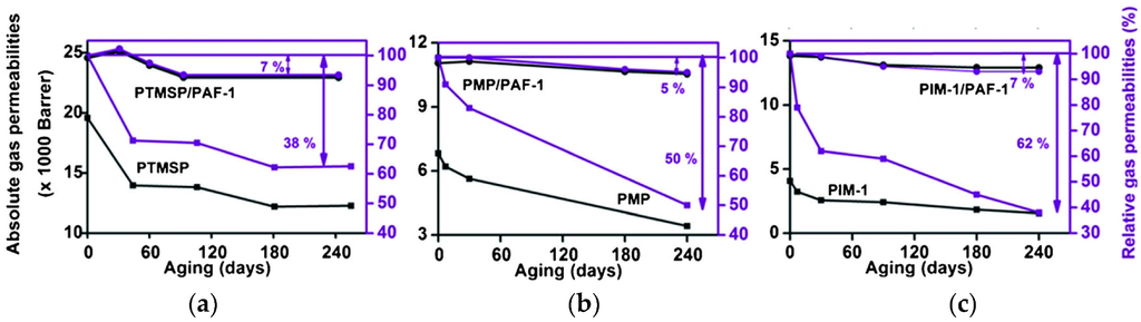 - Kitchin, M.; Teo, J.; Konstas, K.; Lau, C.H.; Sumby, C.J.; Thornton, A.W.; Doonan, C.J.; Hill, M.R. AIMs: A new strategy to control physical aging and gas transport in mixed-matrix membranes. J. Mater. Chem. A 2015, 3, 15241–15247. [Google Scholar] [CrossRef]