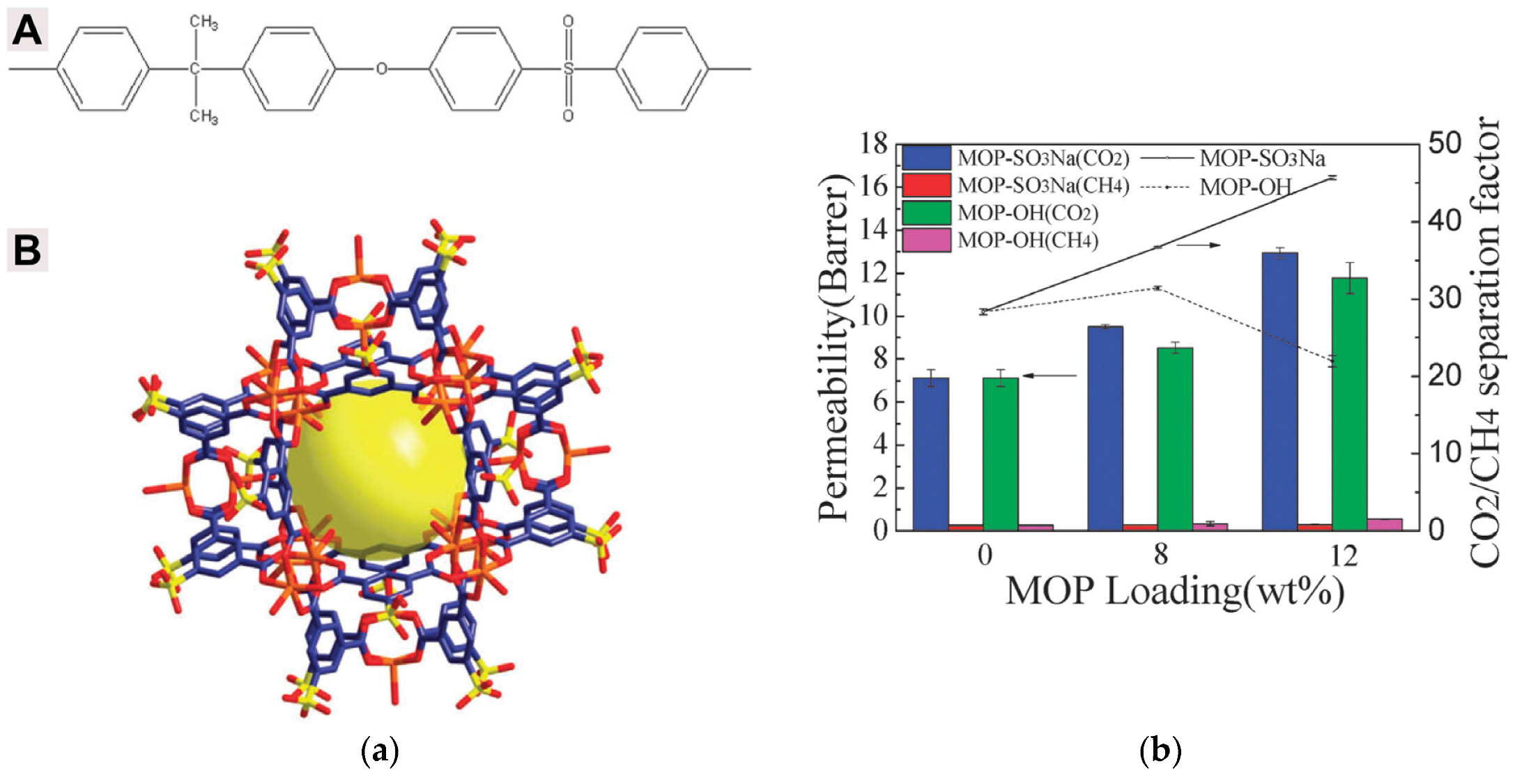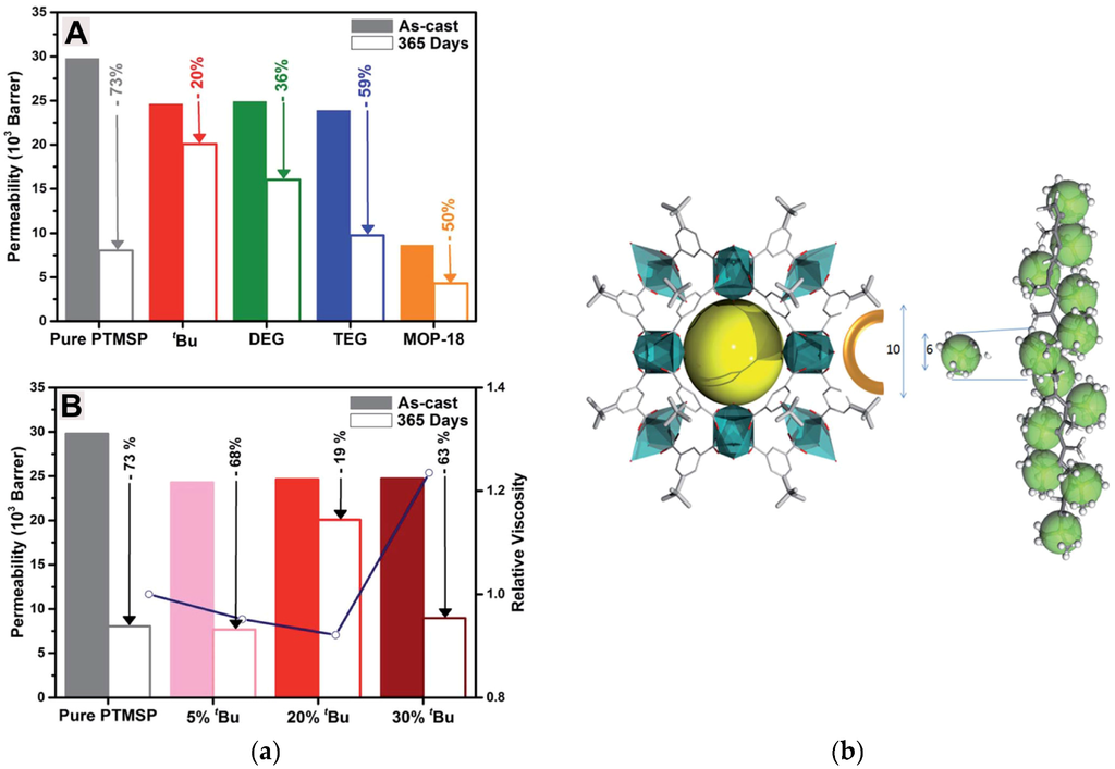 Although the use of MOFs for MMM preparation significantly mitigated interfacial rejections and resulted in membranes free of defects, E. V. Perez, et al. recognized that the limiting factor in achieving a perfect dispersion was the aggregation of the nanocrystals. Aiming to solve this problem, they introduced MOP-18 molecular cages (Figure 14b) into Matrimid® to study the effect this type of hybrid material would have on the gas separation properties of MMMs [125]. Their work showed that MOP-18 was dispersed at the molecular level in the polymer matrix since it both dissolved in the casting solvent and exhibited affinity for the polymer. Gas permeability, however, did not change significantly possibly due to pore blockage by the alkyl chains of the MOP.