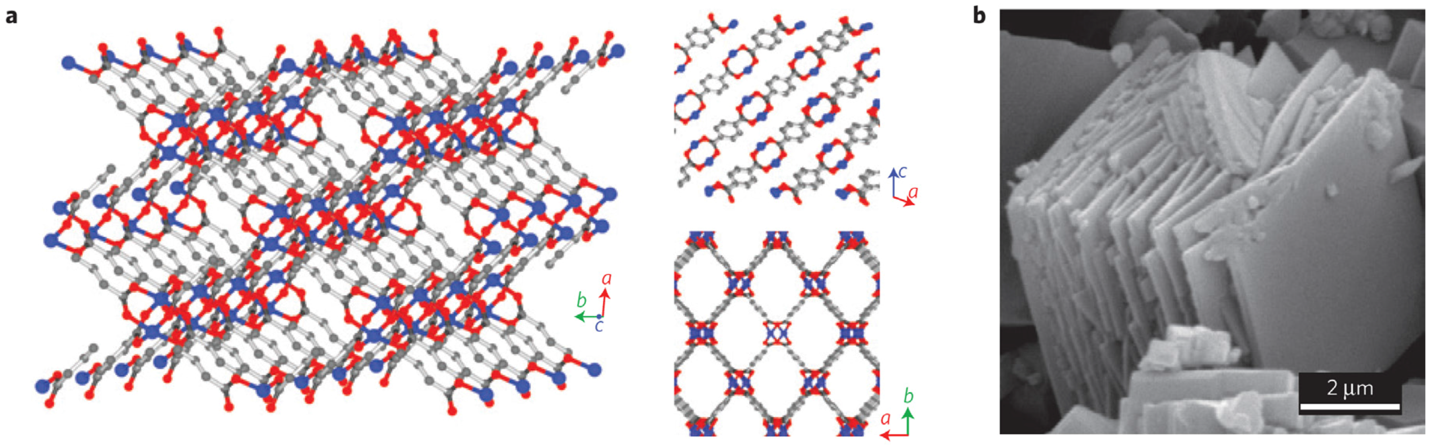 (a) Synthesis of metal-organic framework 5 (MOF-5) from a Zn metal cluster and terephthalic acid. The figure shows the unit cell and the framework drawn using Diamond and crystallographic data from [196]; (b) Synthesis of metal-organic polyhedra 18 (MOP-18) from a copper dimer and alkylated isophthalic acid. Note that the resulting cage does not form frameworks. Drawn using Diamond and crystallographic data from [197]. Yellow spheres show the available volume in the pore.