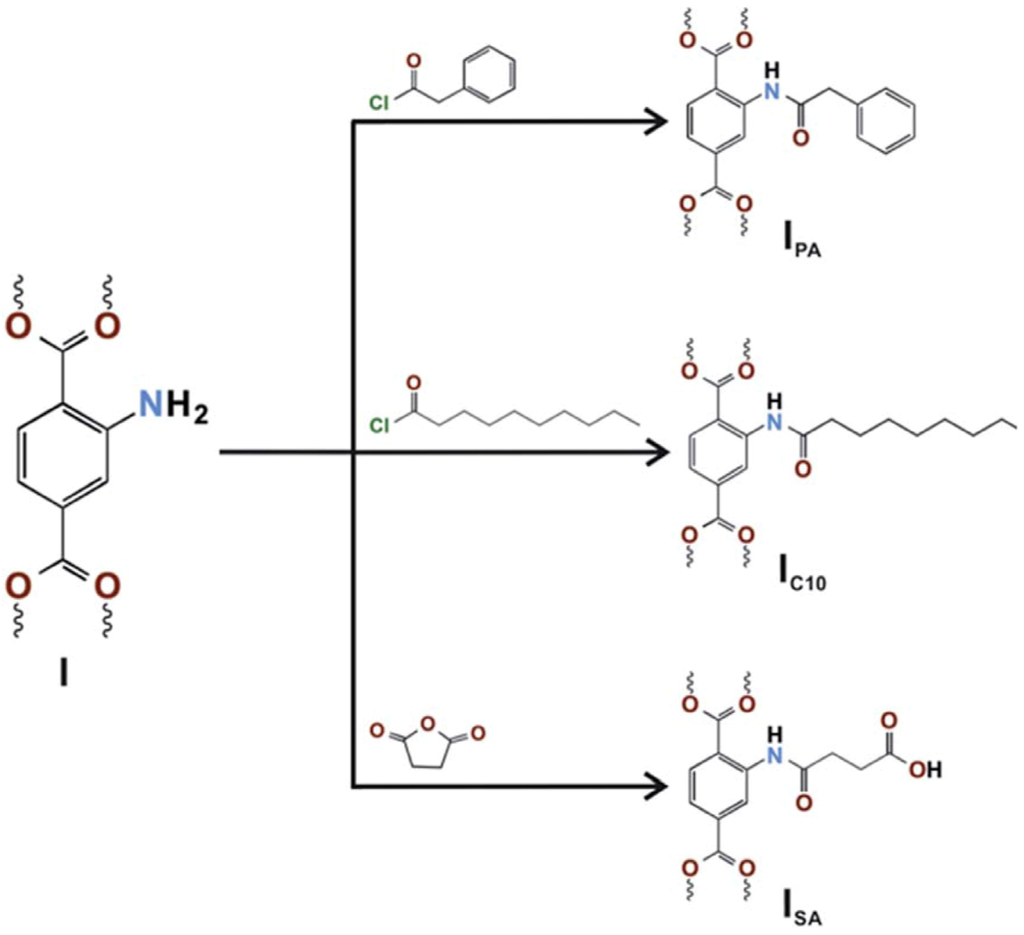 - Morris, W.; Doonan, C.J.; Furukawa, H.; Banerjee, R.; Yaghi, O.M. Crystals as molecules: Postsynthesis covalent functionalization of zeolitic imidazolate frameworks. J. Am. Chem. Soc. 2008, 130, 12626–12627. [Google Scholar] [CrossRef] [PubMed]