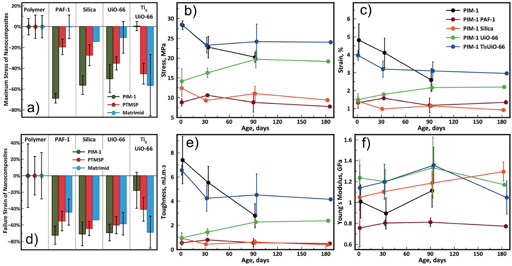 - Smith, S.J.D.; Lau, C.H.; Mardel, J.I.; Kitchin, M.; Konstas, K.; Ladewig, B.P.; Hill, M.R. Physical aging in glassy mixed matrix membranes; tuning particle interaction for mechanically robust nanocomposite films. J. Mater. Chem. A 2016, 4, 10627–10634. [Google Scholar] [CrossRef]