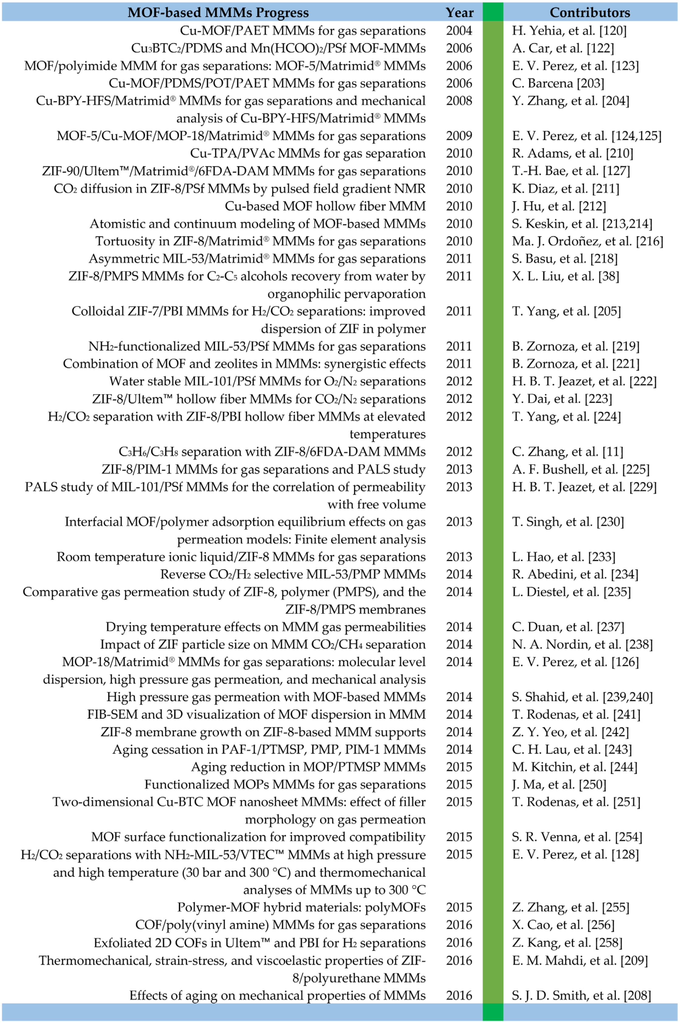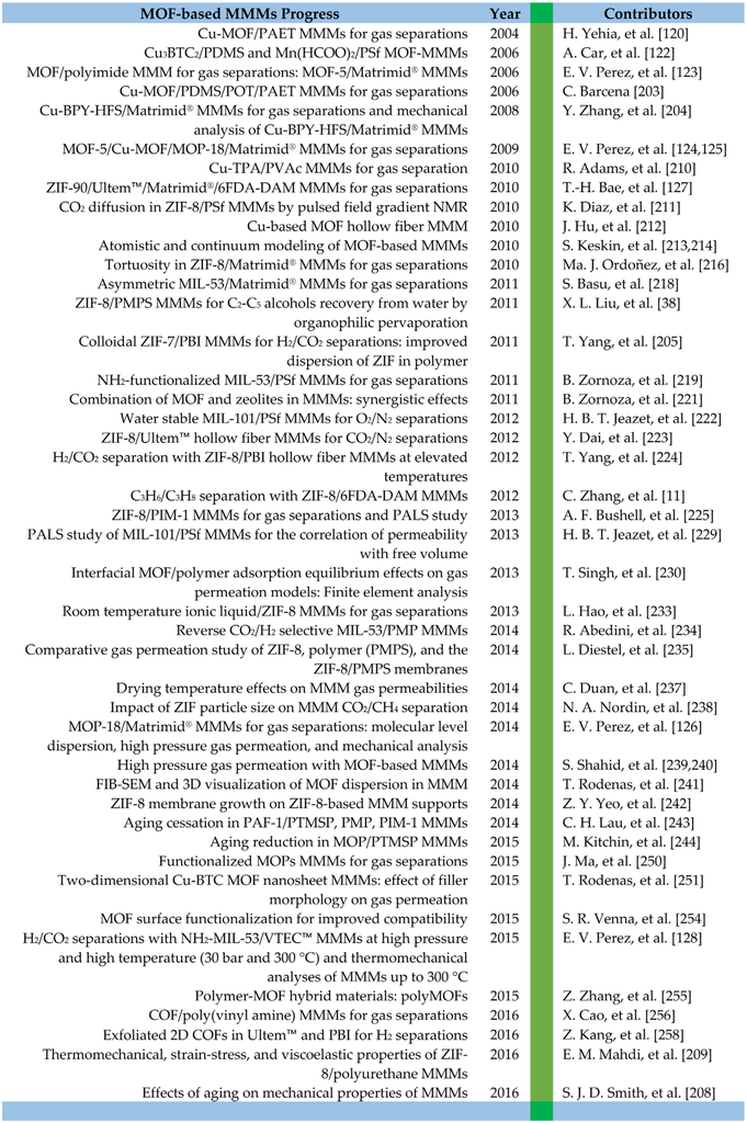 Three years later, in 2009, E. V. Perez, et al. reported on their extensive work on MOF-based MMMs for gas separations showing improved dispersion of MOF nanocrystals and strong interactions between the MOF and the polymer that were attributed to the presence of organic components in the MOF [124,125,126]. Gas transport in these MMMs improved with increased loadings, bringing the membranes to or above the upper bound. In 2010, T.-H. Bae, et al. prepared the first ZIF-based MMM incorporating ZIF-90 into Ultem™, Matrimid®, and 6FDA-DAM [127]. A few years later, in 2015, E. V. Perez, et al. reported that they had successfully tested (Al) NH2-MIL-53/VTEC™ MMMs at pressures up to 30 bar and 300 °C, achieving H2/CO2 mixture selectivities of 8 [128]. The chronological progress for MMMs is shown in Figure 10.