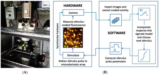 The open-loop and closed-loop system of electrical stimulation, optical recording, automated image analysis and activation curve modeling. (A) A photograph of the system apparatus is shown. The camera is mounted atop the microscope with an inline piezoelectric actuator connected to the 20× objective for high-precision focal plane adjustments. LED fluorescence excitation is digitally controlled, eliminating the need for a shutter. The neuronal culture lives atop the microelectrode array (MEA), which is nested inside of the heated Multi Channel Systems preamplifier. Imaging is carried out inside of an enclosure to eliminate ambient light exposure and reduce the effects of other environmental factors including the laboratory heating and ventilation. The preamplifier is housed inside of this “light tight” imaging chamber and interfaces with the external stimulator. (B) Hardware for delivering electrical stimuli and for optically recording evoked responses (left) interfaces directly with the MATLAB-based software system (MATLAB 7.12, The MathWorks Inc., Natick, MA, USA, 2011) (right). The open-loop experimental configuration is depicted with solid arrows. Predefined stimulus pulse parameters are sent to the stimulator for delivery to the MEA. The stimulator supplies synchronizing triggers to the camera, LED, and preamplifier. Fluorescence is evoked at cell somata that fire action potentials in response to the stimulus. This fluorescence signal is captured by the camera with a series of high-speed digital frames. The set of frames is imported into MATLAB and saved to the hard disk using the Micro-Manager library []. In the closed-loop configuration (dotted lines), the neuronal response is used to inform the calculation of the next iteration of stimulus pulse parameters. Digital images are analyzed using custom software to extract stimulus-evoked action potentials. This newly acquired response data is compiled with previous stimulus iterations and the sigmoid activation model is updated to reflect all measured responses. The next stimulus pulse is then chosen to increase the measurement resolution along the slope of the response curve.