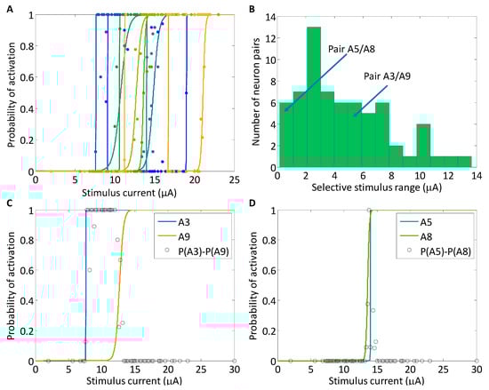 The sigmoidal activation curves for Population A were measured using the closed-loop search routine, and the stimulus pulse width was held constant at 800 μs during the searches. For each neuron, the activation of which was investigated one at a time, the CL search was terminated after 100 stimuli were delivered. The lowest activation threshold, defined as the midpoint of the sigmoid model, was 7.6 μA and the highest threshold was 21.1 μA, although the maximum stimulus current reached 30 μA. Of the twelve activation curves, seven curves lie within less than a 5 μA range from 10.6 μA to 14.8 μA (Figure 2A). We evaluated the stimulus selectivity that was achievable between neurons using the sigmoid activation curves. The selectivity range between a pair of neurons was defined as the stimulus distance between their thresholds, or sigmoid midpoints (Figure 2B). This metric was chosen because, at all points through the selectivity range, the neuron with a lower activation threshold will necessarily activate with probability greater than 0.5 and the neuron with the higher activation threshold will activate with probability less than 0.5. For neurons with vastly differing thresholds, there was a large stimulus range that was selective such that one neuron was exclusively activated. The largest selectivity range was between neurons A3 and A11 over a range of 13.7 μA. The selectivity is non-zero for all pairs of neurons, even along the transition region of the neuronal activation curves. We characterize neuron pairs into three classes of selectivity: highly selective (not shown), moderately selective (Figure 2C), and minimally selective (Figure 2D). For example, between Neurons A1 and A7, there was a highly selectivity range of 8.0 μA in which A7 activated while A1 was silent. Although the activation curve slope of Neuron A9 is shallower than that of other neurons, there is still a 6 μA selectivity range between Neurons A3 and A9 (Figure 2C). For neurons with relatively similar thresholds, as is the case of A5 and A8, selectivity remains non-zero. Even in this extreme example, despite minimal selectivity between the neurons, selectivity is still achievable: at the point 13.8 μA, A8 activated 100% of the time, while A5 never activated. Even at stimuli surrounding that point, there was a non-zero level of selectivity (Figure 2D).