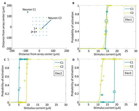(A) The physical locations of the two neurons in Population C are depicted. The three stimulating electrodes used (10 µm diameter, 30 µm spacing) are numbered (black circles). Neurons C1 (dark circle) and C2 (light circle) are located 162 µm and 26 µm, radially, from the center of the array. (B–D) The activation curves found using the CL algorithm for two neurons, C1 (dark shade) and C2 (light shade), are depicted with solid lines. The measurement of the activation probability for each neuron in response to all stimuli delivered are shown with open circles, with the circle radius in proportion to the number of stimuli delivered at that point. (B) The activation curves for both Neurons C1 and C2 found using Electrode 1. The largest open circle along the activation curve of neuron C1 is depicts 29 stimulus responses. (C) The activation curves for both Neurons C1 and C2 found using Electrode 2, and (D), the activation curves for both Neurons C1 and C2 found using Electrode 3.