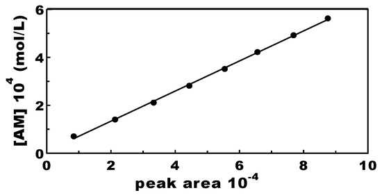 The conversion was determined analyzing the residual monomer concentration. It served to calculate Rp and ν according to a detailed procedure [29]. Briefly, the residual monomer concentration in the samples was monitored using a HPLC system composed of an L-7110 Merck-Hitachi pump (Hitachi, Tokio, Japan) and a SP6 Gynkotek UV detector (Gynkotek, Germering, Germany) operating at λ = 197 nm. The stationary and mobile phases were LiChrosphere 100 RP-18 (Merck, Darmstadt, Germany) and aqueous solutions containing 5 wt% acetonitrile. The flow rate was 1 mL/min. The HPLC system was calibrated using AM solutions of known concentrations. The concentration as a function of the peak area served as calibration parameter (r2 > 0.999). Figure 1 presents the calibration curve of the HPLC system. The samples were mixed with 4 mL of acetonitrile to precipitate and isolate the polymer from the solution. The non-reacted monomers remained in solution. 20 μL of the supernatant were injected for HPLC analysis.