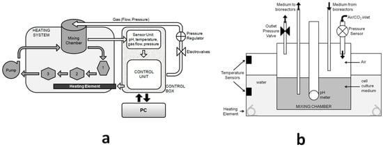The mixing chamber (Figure 1b) is the key element of the system: it contains the pH meter (Electro Chemical Devices, Anaheim, CA, USA, mod. 8602, resolution: ±0.05 pH units) and the gas inlet, as well as flow and pressure sensors (differential air pressure sensor 1337, Phidgets, IncCalgary, AL, Canada, resolution 1.5%). It is connected in series with one or more modular bioreactors through inlet and outlet tubes enabling the cell culture media to flow in the whole circuit.
