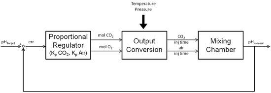 The control system was finally tested with pH perturbations due to external stimuli (i.e., adding 0.1 mL of basic solution pH 10 to the circuit through the mixing chamber). As observed in Figure 5b,c, the system reacts to the altered pH increasing both the injection time of CO2 and air (Figure 5c), and the pH is brought back close to the target value in about 50 s (Figure 5b). When the pH was again below the set threshold, the injection times returned to the initial values. These tests pointed out the high stability and flexibility of the system in different conditions, obtaining results comparable with other reports which employ more complex control strategies [28,29].