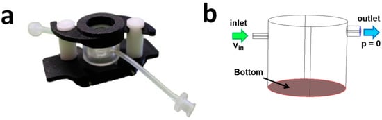 In this study we connected the SUITE platform to the LiveBox1 (LB1, IVTech S.r.l., Massarosa, Italy) bioreactor. LB1 is a single flow transparent bioreactor with an internal hydrodynamic design which ensures a low wall shear stress for high fluid turnover rates. The bioreactor is an upgrade of the MCmB (multi-compartmental modular bioreactor), which has been successfully used with hepatocytes [21,22]. The geometry of LB1 differs slightly from the MCmB, to increase the optical transparency of the system and enable optical imaging during the experiment. In particular, the LB1 consists of a cell culture chamber with inner dimensions similar to the single well of the 24-well plate (Ø 15 mm × 14 mm). It has one inlet and one outlet tube, with dimensions of Ø 1 mm and Ø 2 mm, respectively, placed at the top of the chamber, at a distance of 10 mm with respect to the base of the bioreactor, where cells are placed (Figure 3a). It is made in PDMS (poly-dimethyl-siloxane), with two removable glass coverslips (Ø 20 mm) at the bottom and top surface of the chamber. After the experiment, the LB1 can be disassembled and the glass coverslip supporting the cell monolayer or the 3D construct can be easily removed from its bottom part and used for further investigations and analysis.