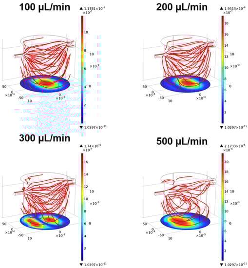 To establish the optimal fluidic conditions in the LB1 and ensure laminar flow and a low shear stress on the cells, parametric models with different inlet flow rates were implemented. In particular, CFD models were used to evaluate flow parameters, such as flow velocity, shear stress, and stream lines in the cell culture chambers, focusing on the bottom surface of the bioreactor where cells are cultured (Figure 3b).