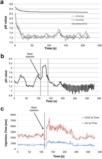 (a) Behavior of pH control at different hydrostatic pressures (20 mmHg, 40 mmHg). The pH is constantly maintained close to the set-point (pH 7.4) in SUITE, but the medium exposed to air at the same temperature (without SUITE) remains alkaline (i.e., pH around 8.26); (b) Reaction to pH changes: a small quantity of NaOH was inserted in the media at t = 100 s, and SUITE quickly reacts and moves the pH back to the set-point; (c) Control output variables (CO2 and air injection times) measured during the base injection test in Figure 5b.