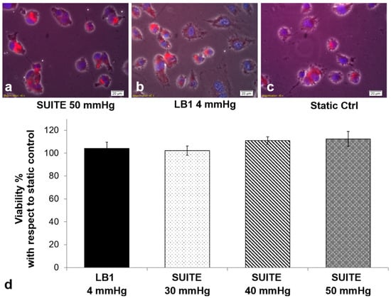 (a–c) Fluorescence micrographs of endothelial cells stained with DAPI (blue) and vWF (red). (d) Viability of HUVEC cells after 4 h in the SUITE system at different hydrostatic pressures, compared with dynamic controls placed in the traditional incubator (in LB1). Data are expressed as a percentages with respect to static controls.