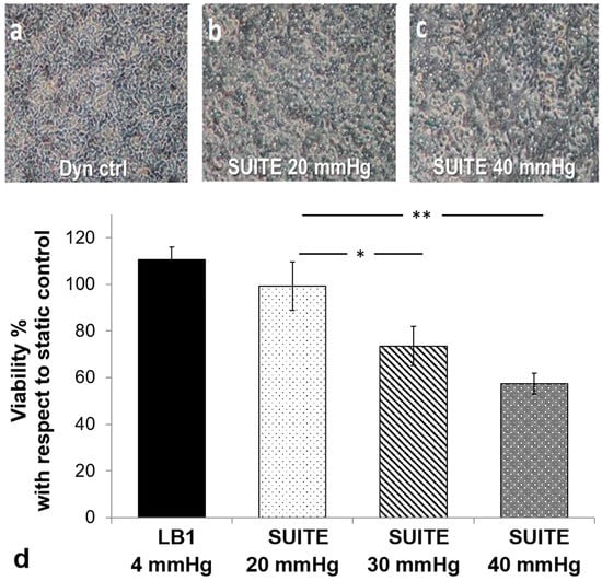(a–c) Images of C3A (20× magnification, bright field) collected after 24 h of cell culture in the LB1 with different hydrostatic pressures: (a) dynamic control = 4.5 mmHg in the incubator; (b) SUITE at 20 mmHg (the threshold for portal hypertension); (c) SUITE at 40 mmHg (cell damage, 50% viability); and (d) the viability of C3A cells after 24 h in the SUITE system, with respect to static controls placed in the traditional incubator. * p < 0.05 comparing 20 mmHg and 30 mmHg; ** p < 0.01 comparing 30 mmHg and 40 mmHg.