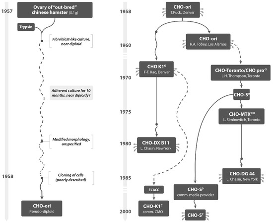 CHO cells have a culture history of more than 50 years, since they were established from the ovary of a Chinese Hamster and became “immortal” in the laboratory of Dr. Theodore Puck in the late 1950s [2,3]. For the sake of simplicity, we call the first immortalized cells ‘CHO-ori’—other names will be discussed later. CHO-ori cells were quickly becoming popular for the study of mammalian genetics and mammalian cell physiology due to two factors: