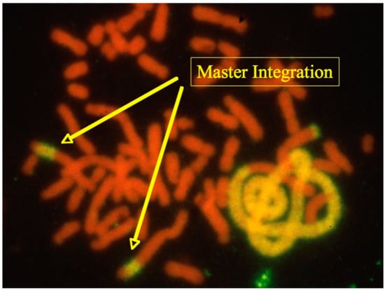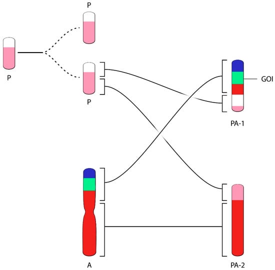 Translocation of a transgene-containing fragment (green, GOI), from the A-chromosome (the original structure, red-green-blue) (containing a long stretch of chromosome 1 and a short fragment of Chromosome 4 of the Hamster) to a duplicated P-chromosome (P is a composite of Chromosomes X and 7 of the Hamster). The new and unusual chromosome is a composite of chromosomes 7, X, 1, and 4. More details of the figures are discussed in the text. Graphics done by C.P. Wurm, Hamburg, Germany, based on images provided in the original publication.