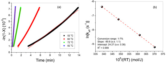 It should be noted that the assumptions used to result in Equation (3) are valid only at low degrees of monomer conversion. Then, from a plot of −ln(1 − X) vs. t, the slope of the initial linear part is directly equal to keff. Such plots at conversion values in the range of 1%–7% have been created and illustrated in Figure 2a. The data followed very good straight lines at high temperatures (i.e., 72 and 82 °C), whereas a slight curvature appeared at the lower temperature of 52 °C (the correlation coefficient, R2, ranged from 0.992–0.999). Then, from the keff values measured at different temperatures, the overall activation energy of the polymerization rate, Eeff, can be estimated from the slope of ln(keff) versus 1/T assuming an Arrhenius-type expression. The individual activation energies of the elementary reactions, i.e., propagation (Ep), initiation (Ei) and termination (Et), are correlated to Eeff according to the following equation, extracted from Equation (2):