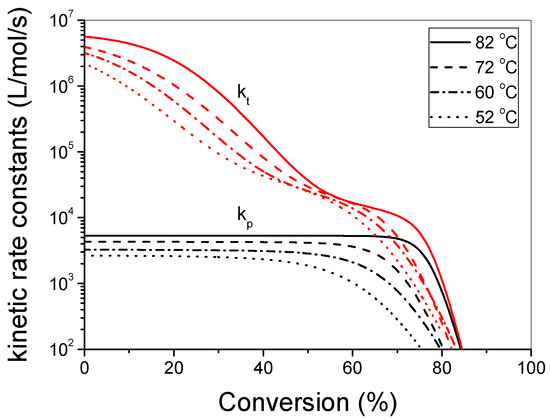 Using the parameters reported in Table 1, the termination and propagation rate constants can be estimated at different temperatures, and results appear in Figure 3. It can be observed that kp maintains a constant value up to 55–75% depending on the temperature. Afterwards, it drops approximately 1.5 orders of magnitude due to the effect of diffusion-controlled phenomena. The kt curve shows a more complex evolution. It drops quickly from its initial value, as growing macro-radicals experience diffusion limitations and autoacceleration occurs. After a reduction by two orders of magnitude and a conversion approximately equal to 50%, reaction-diffusion termination starts to dominate, and the decrease in kt is much more gradual. This slow decrease over the conversion range from 45–65% is due to the fact that the reaction-diffusion termination rate constant, kt,res, is proportional to the monomer concentration, [M], denoted by the unreacted double-bonds’ concentration. Since polymerization proceeds, the latter is still decreasing. When the glass-effect appears and kp starts to drop, kt again decreases through the reaction-diffusion proportionality. Moreover, from Figure 3, it can be observed that at lower temperatures, where both the small molecule and the macro-radical mobility is lower, the effect of diffusion-controlled phenomena is more pronounced in both kt and kp.