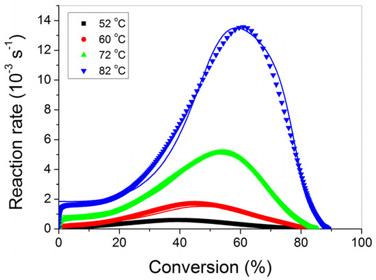 Bulk free-radical polymerization kinetics of PHEMA has been investigated previously by our group at reaction temperatures ranging from 50–80 °C [18,19]. Similar, though slightly different reaction temperatures were also used here in order to check previous results and have appropriate reaction rate data. The variation of heat released with time at temperatures of 52, 60, 72 and 82 °C is illustrated in Figure 1a. From these data, the reaction rate was estimated according to Equation (1). By integrating this equation, the monomer double bond conversion was calculated and is plotted in Figure 1b at all reaction temperatures studied.