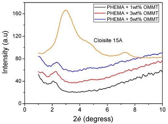 XRD diffraction patterns of the organomodified montmorillonite (OMMT) (Cloisite 15A) used and the PHEMA/OMMT nanocomposites.