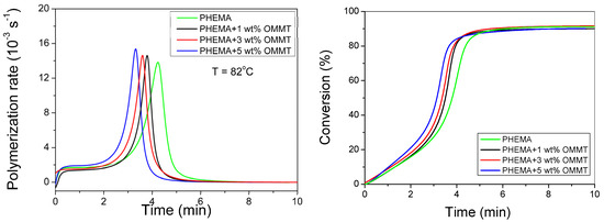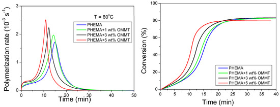 3.2. Polymerization Kinetics during the Formation of PΗΕΜΑ/OMMT Nanocomposites