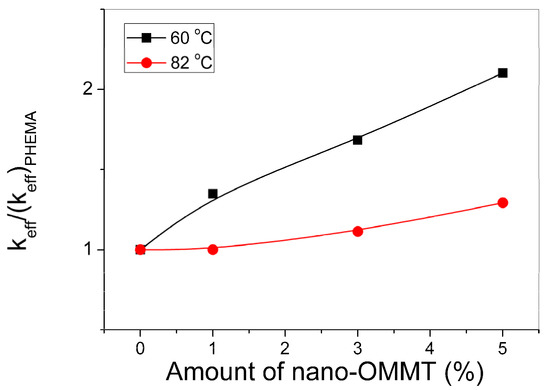 The effective rate constants were estimated at both 60 and 82 °C according to the procedure described in the previous section. The relative amounts of keff compared to that of neat PHEMA, appear in Figure 8. It was observed that, at relatively low temperatures (i.e., 60 °C), the relative effective rate constant significantly increases with the amount of the nano-OMMT, whereas at higher temperatures, a much lower increase is clear.