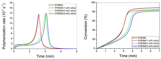 3.3. Polymerization Kinetics during the Formation of PΗΕΜΑ/Silica Nanocomposites