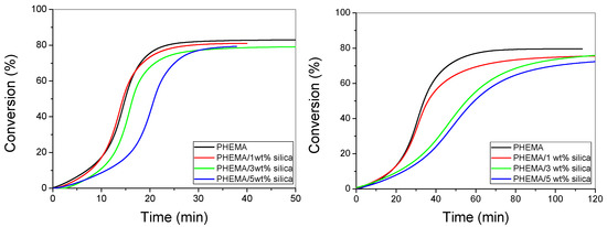 Effect of the amount of nano-silica on the variation of conversion with time during polymerization of HEMA at 60 (a) and 52 °C (b).