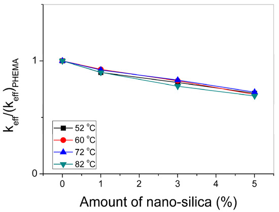 Furthermore, the effective rate constants were estimated at all four temperatures, according to the procedure described in the previous section. The relative amounts of keff compared to that of neat PHEMA appear in Figure 11. It can be noticed that, at all reaction temperatures, the relative effective rate constant significantly decreases with the amount of the nano-silica, reaching almost 70% of the initial value when adding 5% of the nano-additive.