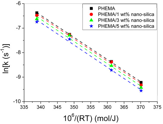 Arrhenius-type plots to calculate the overall (effective) activation energies of PHEMA/nano-silica nanocomposites.