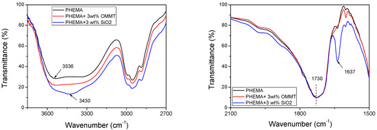 In the C=O stretching region, two contributions around 1730 and 1637 cm−1 were identified. Again, these bands are assigned to free C=O groups and hydrogen-bonded carbonyl groups, respectively [26]. The peak position and width of the band around 1730 cm−1 slightly changed with the addition of the nanofiller, whereas for the band around 1637 cm−1, the position again slightly changed, although its width varied significantly. Particularly, the peak at 1637 cm−1 almost disappeared at the PHEMA/OMMT nanocomposite, whereas it became very broad and intensive in the PHEMA/silica materials. Therefore, it seems that only a small number of hydrogen bonded C=O appears in neat PHEMA, which is negligible in PHEMA/OMMT nanocomposites. In contrast, in the C=O stretching region, it was found that the association of the -type of hydrogen bond occurs to a large extent when silica is used.