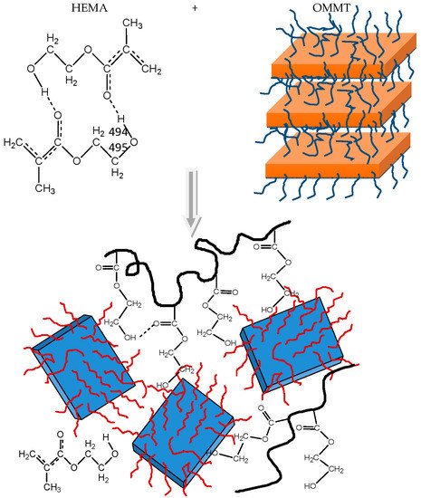 During the last decade, research on the synthesis of nanocomposite materials based on a polymer matrix has grown rapidly because of the improved mechanical, thermal and physical properties that are provided by the polymer. Several types of nano-fillers have been used, such as nano-clays, nano-silica, carbon nanotubes, fullerenes, graphene, etc. In this research, we investigated the formation of PHEMA-based nanocomposites with either a nano-organomodified montmorillonite (OMMT) or nano-silica. Incorporation of MMT is well known to improve the mechanical properties of the polymer matrix [8,9], whereas adding silica to PHEMA results in bioactive materials that keep the swelling properties of neat polymer; thus, they assure both morphological and bioactive characteristics [7]. Nanocomposites can be prepared by various methods, such as in situ polymerization, melt intercalation/exfoliation and solution casting. The in situ polymerization method was used here in order to obtain nanocomposites with a uniform dispersion of the filler in the polymer matrix.