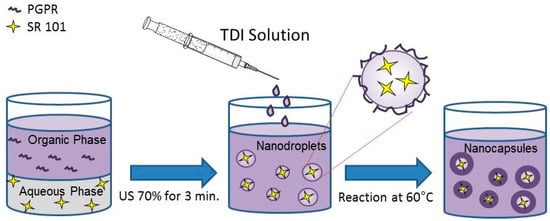 Starch nanocapsules (NCs) were prepared by interfacial polymerization by inverse mini-emulsion at 60 °C for 2 h, based on a procedure proposed in the literature [3,18], except for the fact that the dispersed phase was prepared from gelatinizing 0.1 g of starch under stirring for 30 min at 90 °C in a mixture of 50 mg of sodium chloride and 1.3 g of water. When copper salt was used, NaCl was partially replaced by previously-dried CuSO4·5H2O. Subsequently, the macroemulsion was formed by adding the continuous phase, composed of 7.5 g of cyclohexane and PGPR (varied in the range from 10 to 20 wt% related to the disperse phase), to the disperse phase and by stirring over 1 h at room temperature. The mini-emulsion was created by sonication for 3 min at 70% of amplitude in a pulsed regime (20 s on, 10 s pause) using a Branson Sonifier W-450-Digital (Thermo Fisher Scientific, WA, USA) under ice cooling to prevent the evaporation of the continuous phase. A clear solution of cyclohexane (5 g), PGPR (30 mg), and TDI (varied in the range from 80 to 200 mg), previously prepared, was added dropwise to the mini-emulsion for 1 min. The reaction was performed for 2 h at 60 °C or for 24 h at 25 °C, under magnetic stirring. Figure 1 illustrates the different steps. Dye-loaded cross-linked starch NCs were prepared, in brief, replacing the water that composes the dispersed phase by a 0.02 wt% SR 101 aqueous solution.
