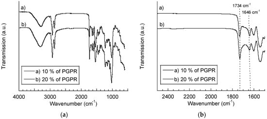 The effect of surfactant concentration on shell composition. Results were obtained by FT-IR using ATR mode. (a) Spectra between 4000 and 500 cm−1; and (b) spectra in detail between 2500 and 1500 cm−1.