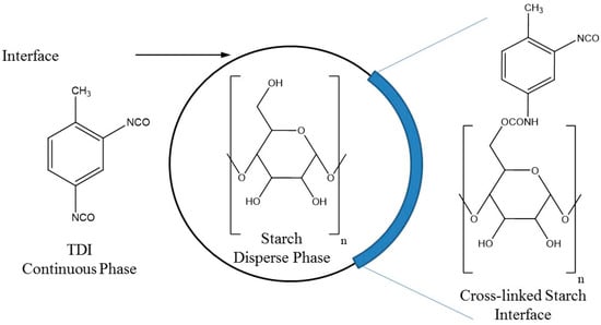 Schematic illustration of interfacial polymerization between NCO groups from TDI and OH groups from starch by inverse mini-emulsion.