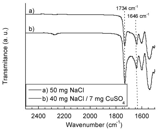 The effect of the type of salt on the NC shell composition was evaluated using 120 mg of TDI. A comparison between FT-IR spectra of samples is shown in Figure 5. The shell composition of particles obtained using CuSO4 presents a higher fraction of urethane groups, as can be observed by the growth of its characteristic peak at 1734 cm−1. Smaller particle sizes of reactions using CuSO4 resulted in a higher interfacial area, favoring the cross-linking reaction between starch and TDI forming urethane groups. Since the side reaction between NCO groups from TDI and OH groups from water were reduced by partially replacing NaCl by CuSO4, as can be observed by the decrease of the characteristic peak of carbonyl of urea groups at 1646 cm−1, as mentioned in the previous section, particles swell more after redispersion in water (shown in Table 2).