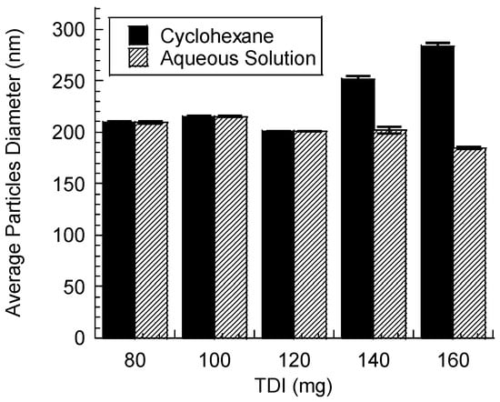 The effect of the amount of TDI on the average particle size using 10 wt% of PGPR related to the dispersed phase (error bars represent standard deviation, n ≥ 3).