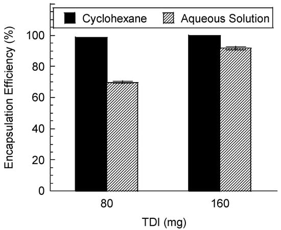 Encapsulation efficiency of SR 101 in NCs prepared with different amounts of TDI (error bars represent standard deviation, n ≥ 3).