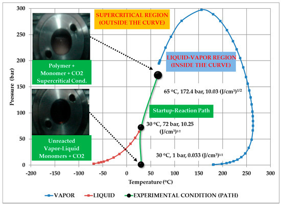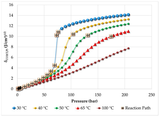 A plot of calculated δCO2 versus pressure, using an equation of state [21,22], is shown in Figure 2. The calculations were carried out by us. It is observed that large changes in δCO2 are obtained when pressure is increased following an isothermal route, whereas a small reduction occurs if an isochoric route is used. Also shown in Figure 2 is the process/reaction path followed by the reacting mixture. The major change in the value of δCO2 occurs at approximately 72 bar. At 68 bar and 30 °C δCO2 = 4.54 (J/cm3)1/2, but at 72 bar, δCO2 = 10.25 (J/cm3)1/2. The reason is that 30 °C and 72 bar is close to the critical point of CO2, which occurs at 31 °C and 73.8 bar. At the critical point, the densities of gas and liquid CO2 are the same. As density increases, CO2 works as a true solvent. The reaction mixture can be considered dispersed in CO2 beyond this point. However, only when the mixture achieves 65 °C and 172.4 bars, it can be considered as one phase at supercritical conditions.