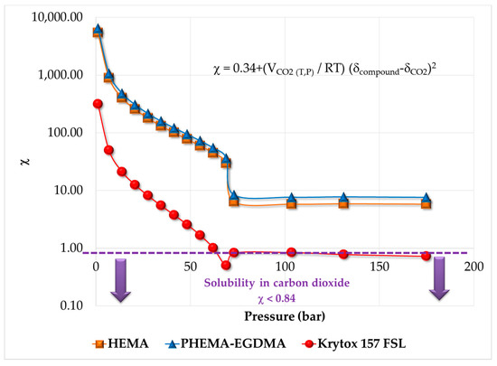 Therefore, it is important to evaluate the solubility of components, including Krytox, in supercritical carbon dioxide. The solubility parameter of CO2 (δCO2(T,P)) was taken from the literature [20,21,22], and its molar volume (VCO2(T,P)) was calculated using an equation of state [21,22]. The solubility parameters for HEMA (25 (J/cm3)1/2) and Krytox (6.02 (J/cm3)1/2), were taken from the literature [20,23]. In the case of the polymer network, δsolute (26.6 (J/cm3)1/2) was estimated using group contribution theory [24]. One criterion to determine if a solute is soluble in a solvent is to calculate its Flory interaction parameter, χ, using Equation (5); if χ < 0.84, then the component should be soluble in CO2 at the given T and P [24].