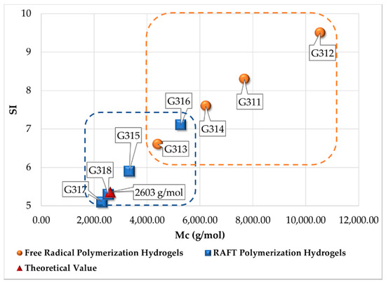 Two polymer populations for the case of polymer networks synthesized by FRP are observed in Figure 5. The first population contains short chains with individual Mci values smaller than the theoretical value of 2603 g/mol, and the second population contains larger chains with individual Mci values higher than 2603 g/mol. In the case of short chains linking crosslink points (nodes), the polymer network is so tight and the pores so small that swelling with water in those regions is negligible. Therefore, the overall swelling measured for these polymer networks synthesized by FRP is attributable to the regions with long chain segments between crosslinks. It is this second population that is the one responsible for increasing the average value of Mc and, thus, causing such large values of SI, as observed in Figure 4.