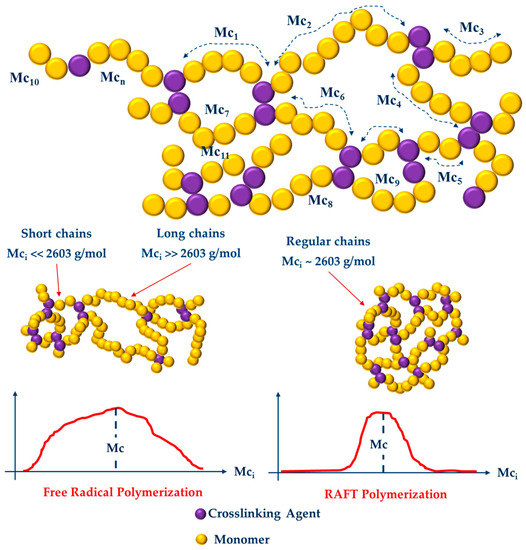 Schematic representation of the Mc distribution in polymer networks and how they differ for hydrogels synthesized by FRP and RAFT copolymerizations.