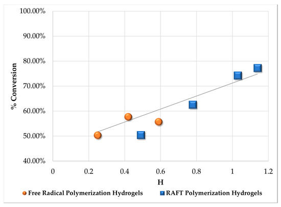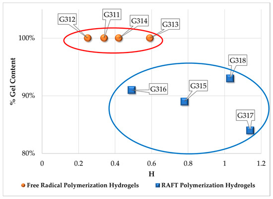 The relationship between gel content and H is shown in Figure 6, where two different populations are clearly observed. The first population corresponds to polymer networks synthesized by FRP and the second one to polymer networks synthesized by RAFT copolymerization. One hundred percent gel content is observed for the polymer networks synthesized by FRP, whereas ~90% gel content was obtained for the materials synthesized by RAFT copolymerization. It seems that in polymer networks synthesized by RAFT copolymerization, the slower polymerization rate causes polymer chains of low to medium molecular weight produced late in the polymerization to encounter mobility restrictions at high viscosities, thus reaching lower limiting conversions, whereas in polymer networks synthesized by FRP monomer disappears quickly, and medium-sized polymer networks rapidly become part of the gel by propagation through pendant double bonds or termination with radicals placed within the polymer network.