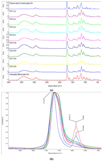 An internal standard was used for quantification purposes. A summary of the assignment of functional groups to the different bands is shown in Table 4. The signal at 1717 cm−1 corresponds to carbonyl groups –C=O, which remained unreacted and depend on HEMA and EDGMA initial concentrations only. The area for the –C=O band calculated for each sample was considered as the internal reference (AC=O). Also observed in Table 4 are two regions for double bonds. The most promising region to evaluate remaining double bonds was 1635 cm−1 in wavelength, so we integrated those peaks (AC=C).