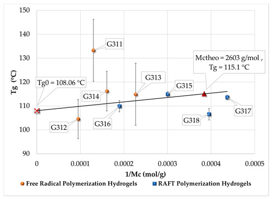 Relationship between Tg measured by modulated differential scanning calorimetry (MDSC) and 1/Mc for hydrogels synthesized by FRP and RAFT copolymerizations.