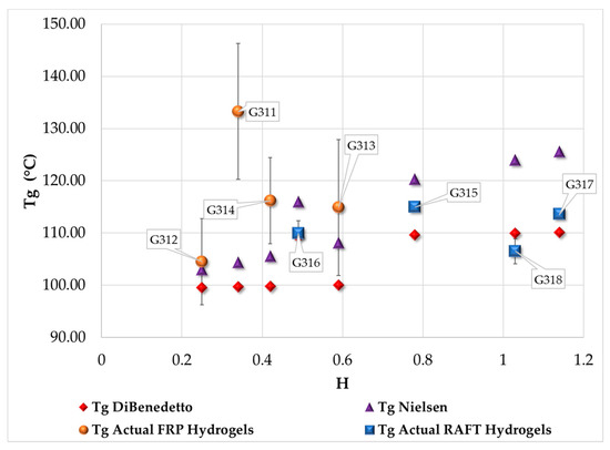 Figure 10 shows a plot of measured and calculated values of Tg versus H. The values of Mc used in the calculation of Tg were the ones obtained experimentally. It is observed that the calculated values of Tg using either equation agree well between themselves in the region of H < 0.5, but differ significantly when H > 0.5. It is also observed in Figure 10 that Tg values for polymer networks synthesized by FRP are adequately predicted with the Nielsen equation (10% mean error), whereas DiBenedetto’s equation works better for RAFT synthesized polymer networks (3% average error). Except for sample G311, which can be considered as an outlier, the overall agreement between experimental and estimated values of Tg using typical correlations is fairly good.