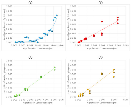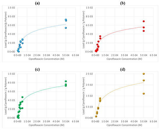 Six polymer network samples of 3 ± 0.2 mg each were placed into flasks with different concentrations of ciprofloxacin (5 mL of water in each sample): 1 × 10−5, 3 × 10−5, 6 × 10−5, 8 × 10−5, 2 × 10−4 and 4 × 10−4 M. Each vial was shaken for 24 h. The samples were then filtrated. The remaining solution was analyzed in a UV-visible spectrophotometer at λ = 276.2 nm. Isotherm charts were built from these data.