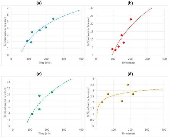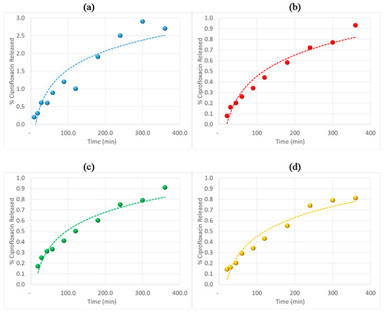 Ciprofloxacin release rate from polymer networks synthetized by RAFT copolymerization. Samples: (a) G315; (b) G316; (c) G317; and (d) G318.