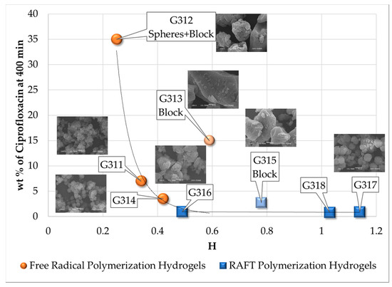 In order to get a better understanding of the relationship between ciprofloxacin release rate and polymer network homogeneity, a plot of wt% ciprofloxacin released at 400 min vs. H is shown in Figure 18. Except for samples with block only morphologies (samples G313 and G315, both synthesized using Krytox), a clear difference in ciprofloxacin release performance between the two types of polymer networks (FRP and RAFT synthesized) is observed (see the trend lines in Figure 18). It seems that samples having block morphologies release higher amounts of ciprofloxacin, compared to the analogous samples with raspberry morphologies. In order to understand this behavior, we have to keep in mind that block morphologies are assumed to be less restrictive for ciprofloxacin escape from the hydrogel matrix. Ciprofloxacin molecules must escape from the block, and no further organized hydrogel matrices are found. Holes between blocks are big enough to consider them as a bulky phase. Raspberry morphologies, on the other hand, represent a major escape challenge, since ciprofloxacin molecules must escape the volume within individual spheres, between neighbor spheres and between raspberry bunches. These spaces are too close among themselves to be considered as a bulky phase. This concept is illustrated in Figure 4 of Pérez-Salinas et al. [26].